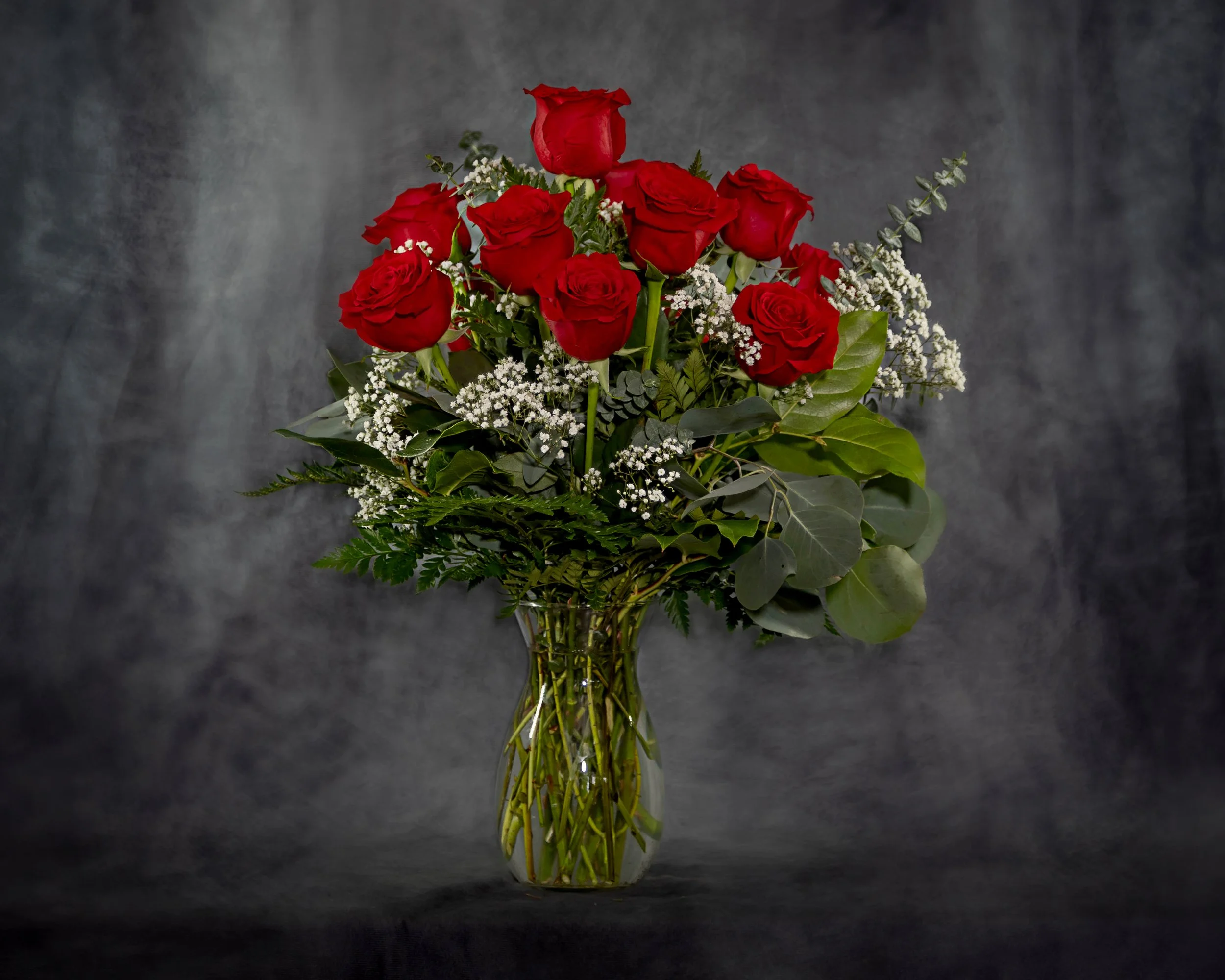 12 stunning red roses paired with lush foliage and baby’s breath